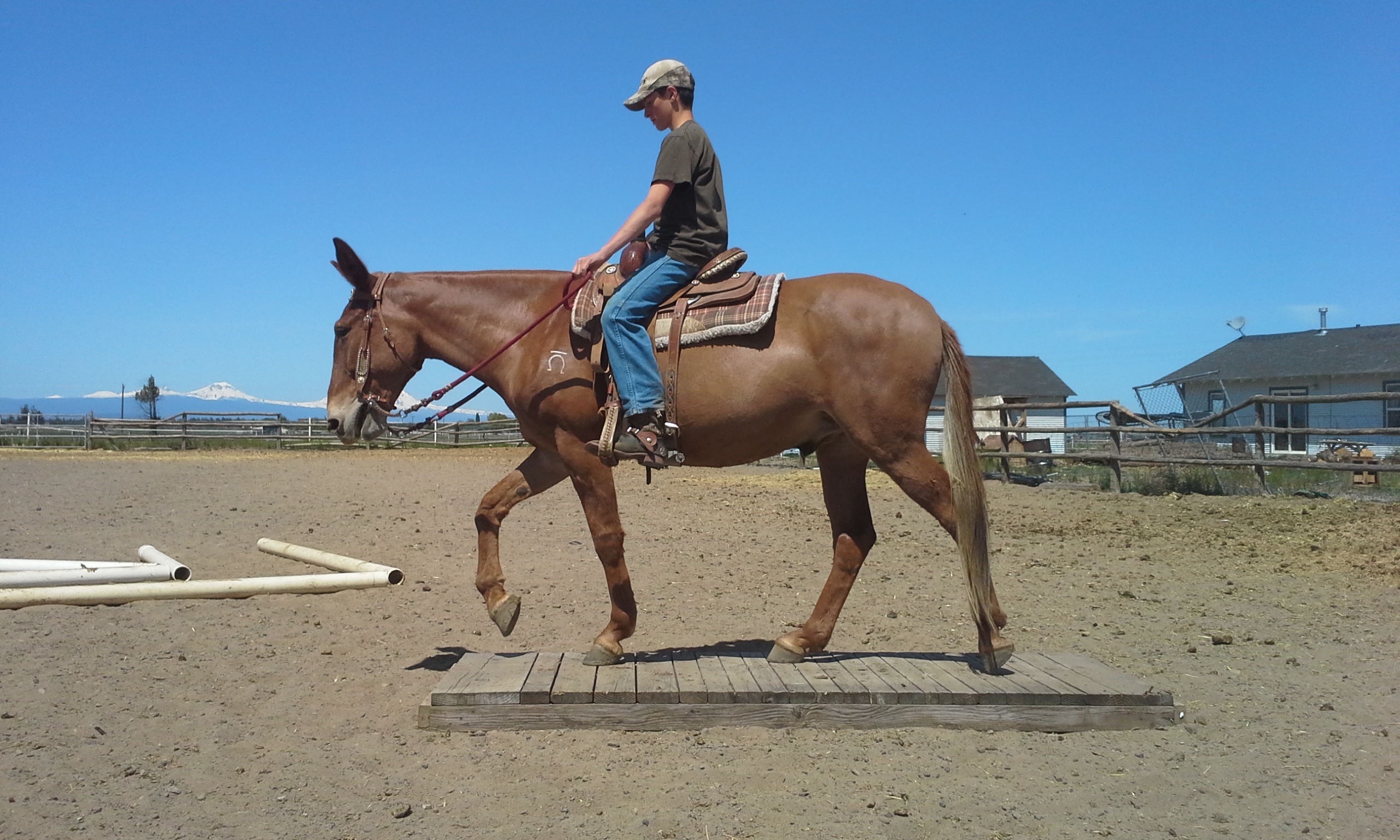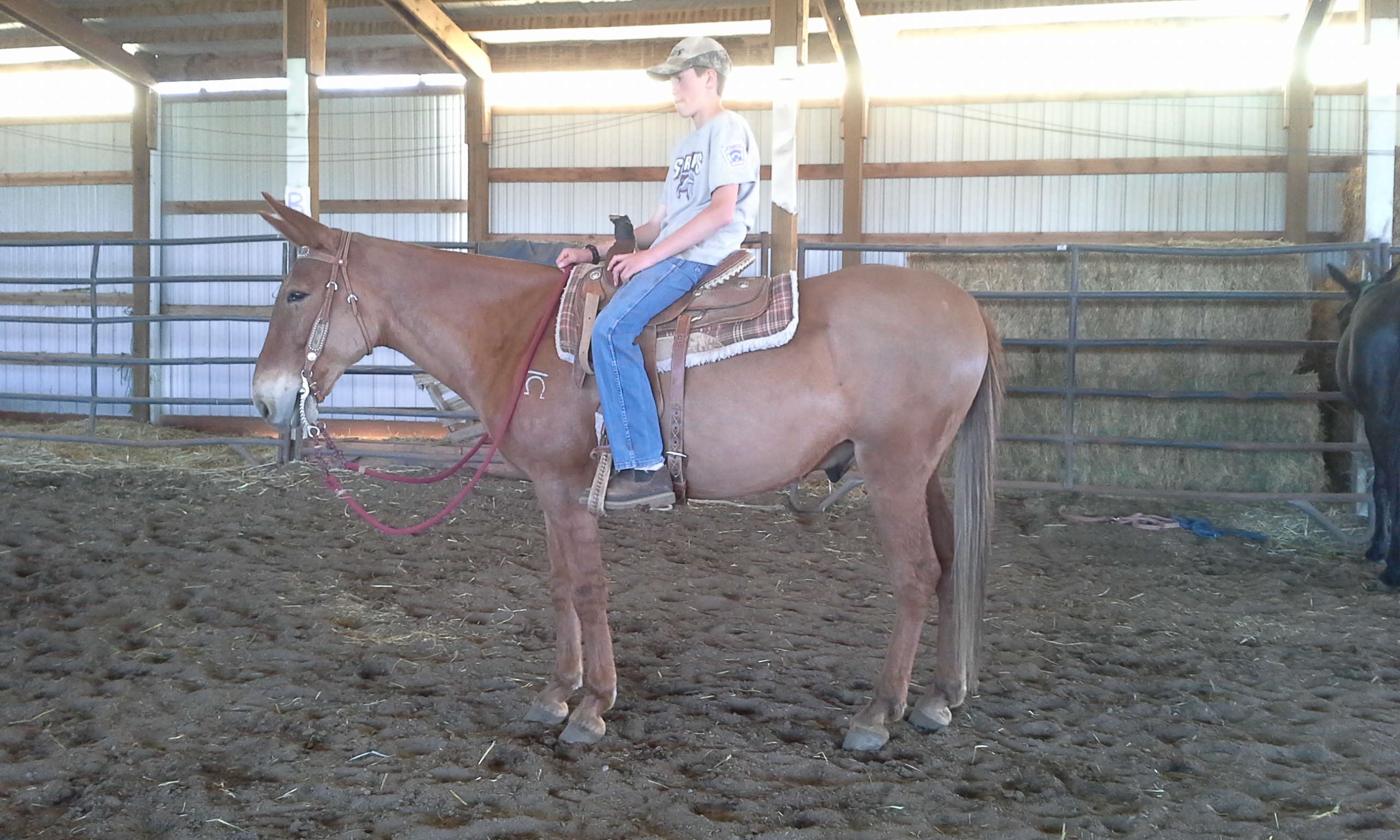 This is a solid riding mule. He can go in the arena and do a complete trail course or head to the top of the mountains in the front or in the back of the line. This all around mule has a good neck rein and baby lope that is smooth as silk. He is a 15 Hand quarter type good bodied mule. Hauls, clips, baths and could almost wash the car if you asked. Reed can be ridden by many people and get along fine. Crosses bridges, water or the sidewalk in the city, does not matter to this mule.